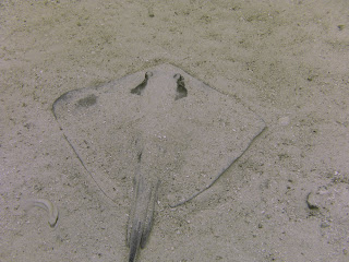 This is a southern sting ray, which is in the same family of the ray that killed Steve Irwin. That was a freak thing of course, and I do not touch things underwater (ignoring the sharks that somehow are drawn to me and waller all over me--that is them touching me, not the other way around, and that is completely different). The only reason a sting ray would normally react to a person is if you stepped on him, then he might whack you with that stinger he has on the end of his tail. Otherwise, he would stay put resting down there forever or until he got hungry.